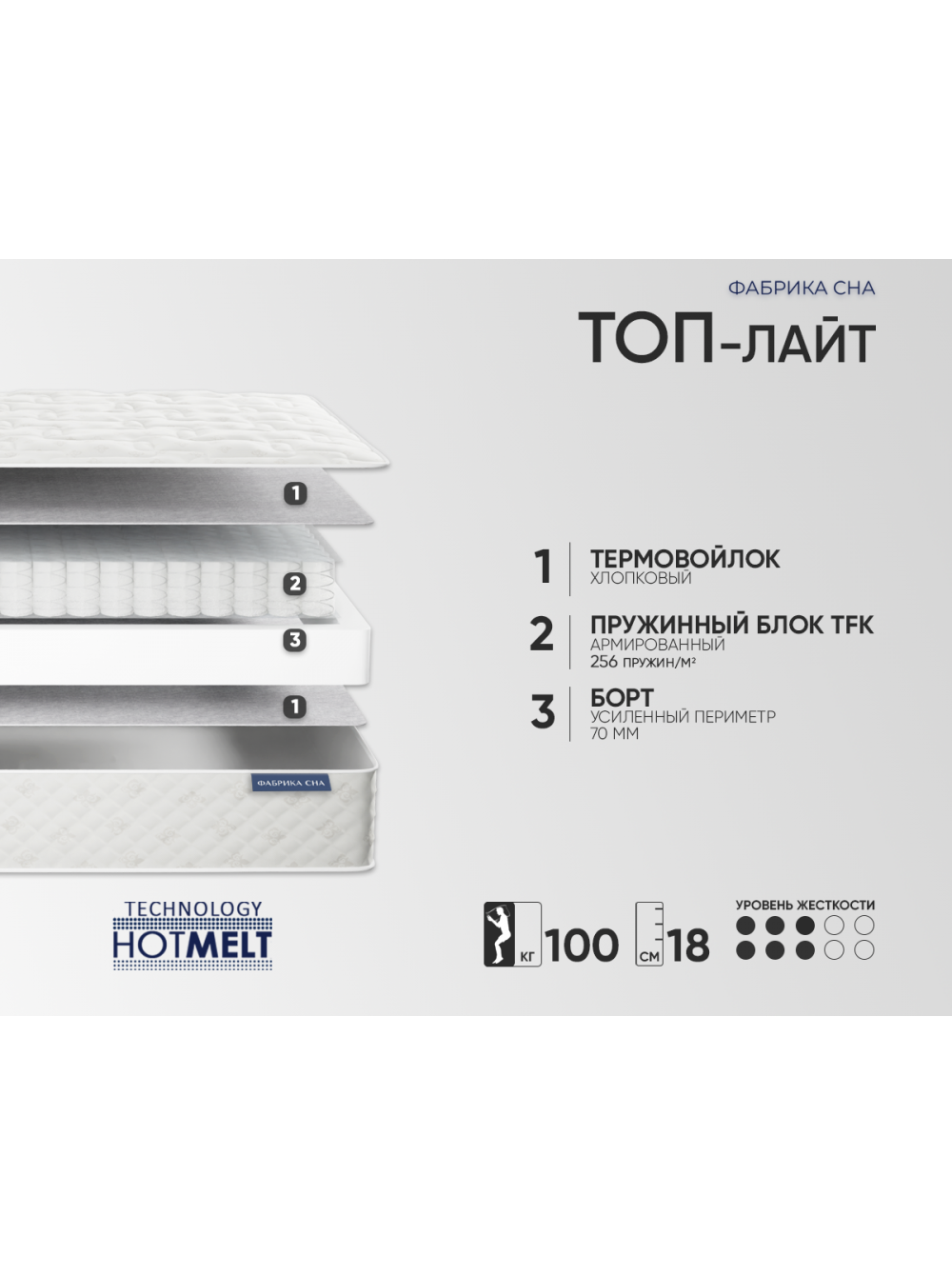 4. Евро периметр Система жесткого периметра матраса выполнена из пены высокой плотности толщиной 70 мм. Располагается внутри матраса, создает идеальную форму его боковой части и дополнительно повышает жесткость краев, защищая их от проседания при нагрузках.